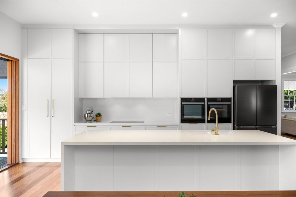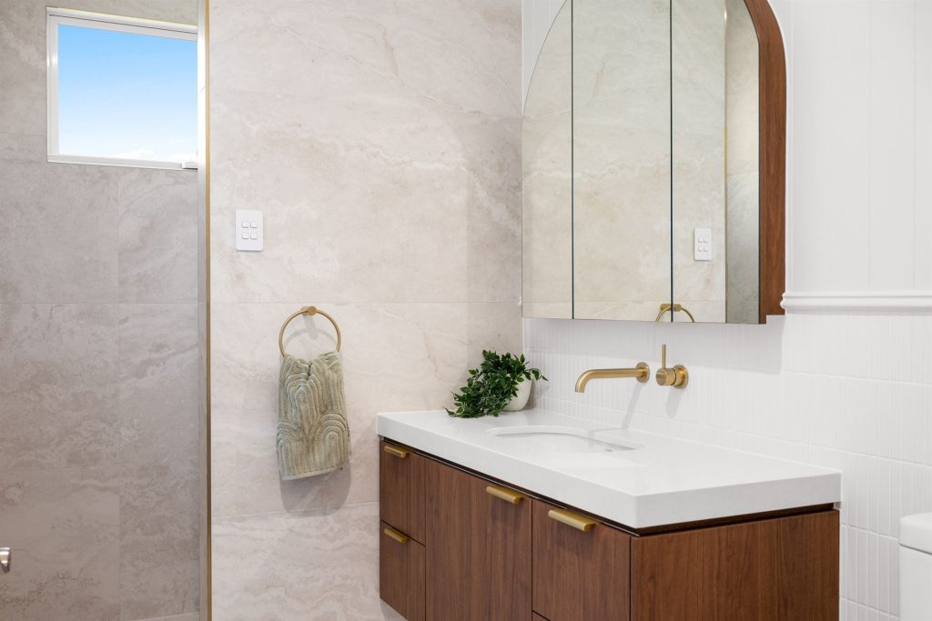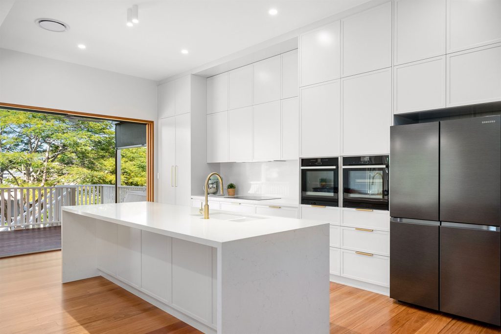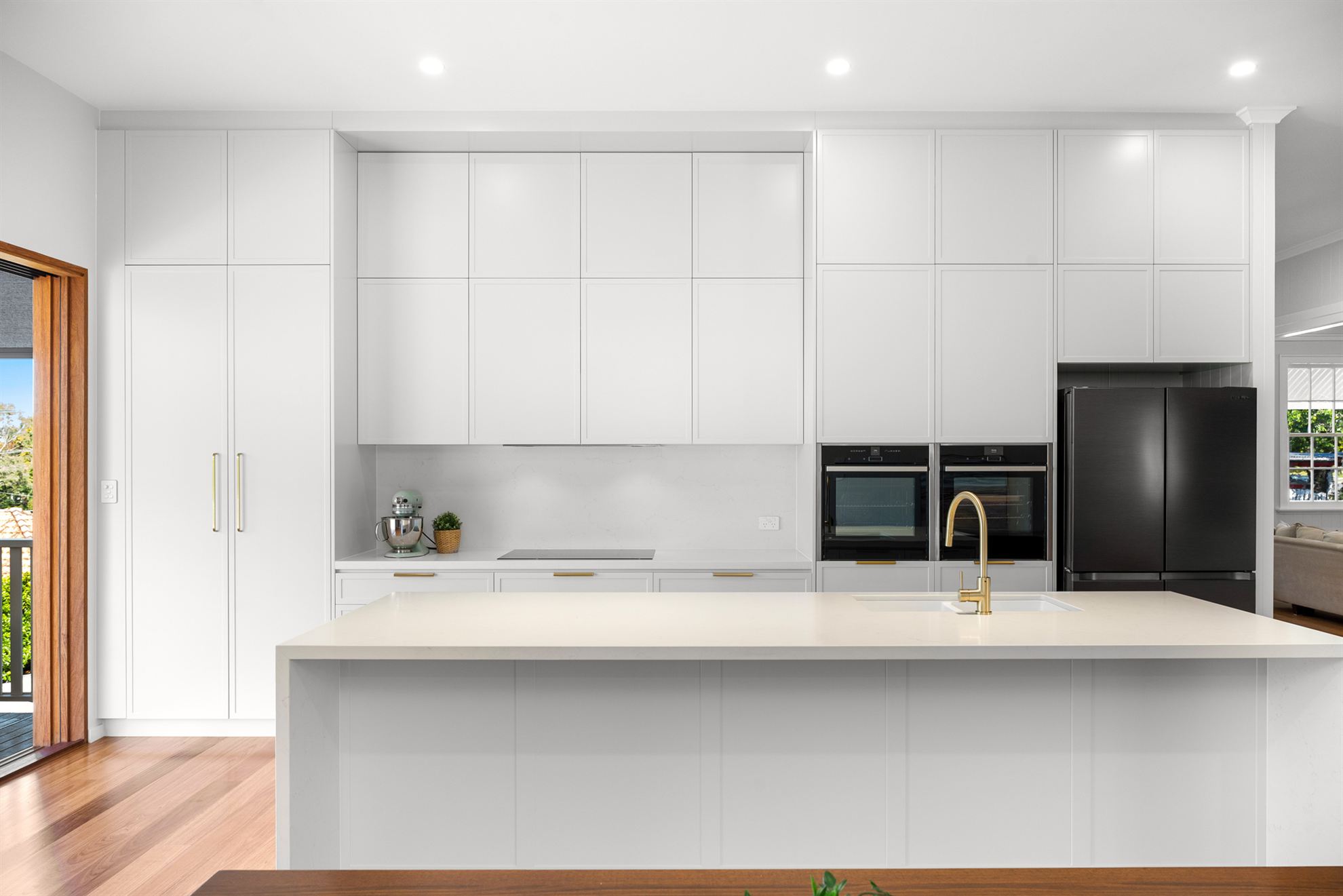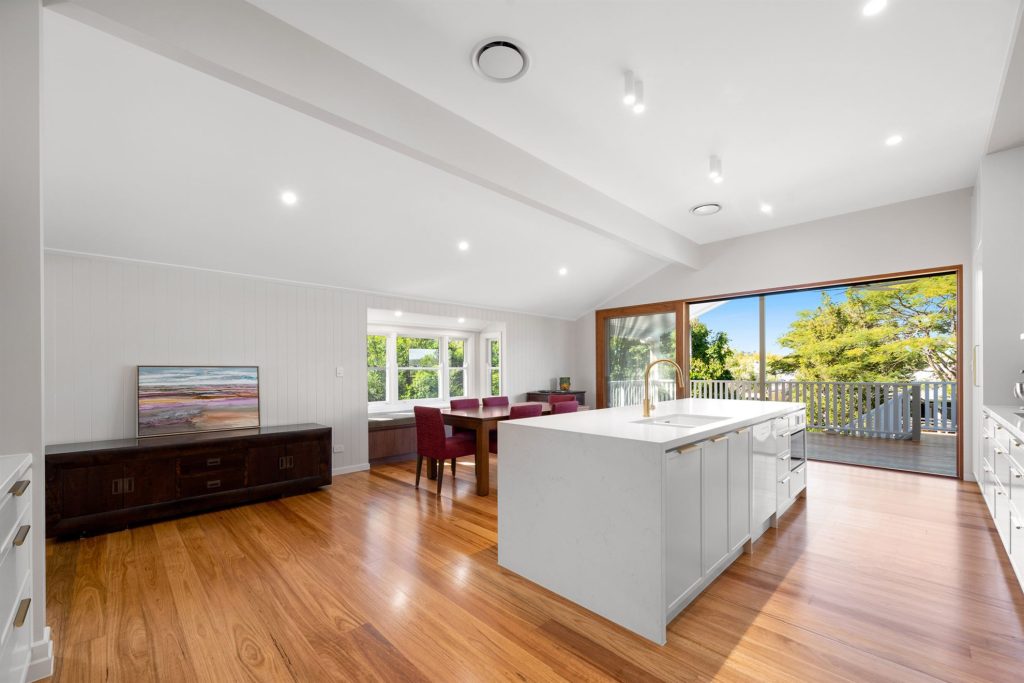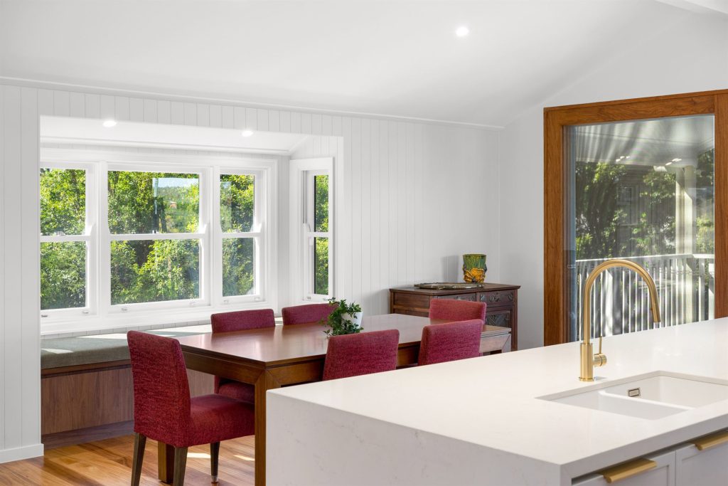 The open-plan kitchen and dining area exemplify the fusion of old and new, with crisp white cabinetry, brass fittings, and rich timber accents creating a welcoming, functional hub. Large bifold doors open the living space onto a spacious deck, ideal for seamless indoor-outdoor entertaining. The elevated position offers leafy outlooks while drawing in an abundance of natural light throughout the home.